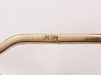 東京小間物化粧品卸商同業組合長、貴金屬小間物卸商。 義太夫謠曲を趣味とした。 昭和初期のお品。 「金」を用いた豪華なかんざしです。 飾り部の牡丹は「純金」で製作され、裏に刻印が捺されています。 また扇にMの商店マークもあり。 縁には緻密な装飾彫りが入っており、 伸びる足は「K18」刻印、こちらも金製による高級感あふれる逸品です。 状態